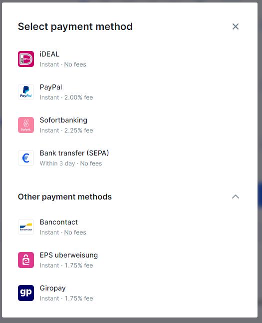 Kies de betalingsmethode waarmee je fiatgeld wilt storten. Bitvavo biedt meestal verschillende opties, zoals bankoverschrijvingen, iDEAL, SEPA, enz.